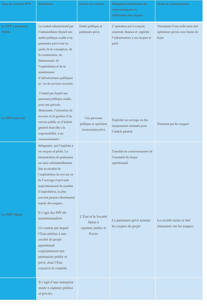 Les principaux types de PPP sont les suivants :